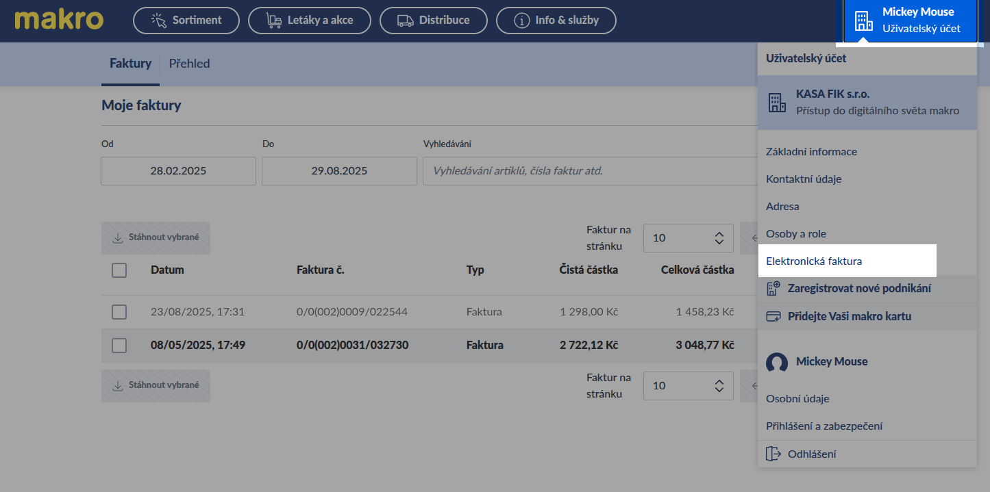 - V portálu Makro na adrese https://docs.makro.cz/ v sekci Elektronické faktury neleznete seznam vystavených faktur. Stažený soubor nahrajte v Backoffice pro automatický import.